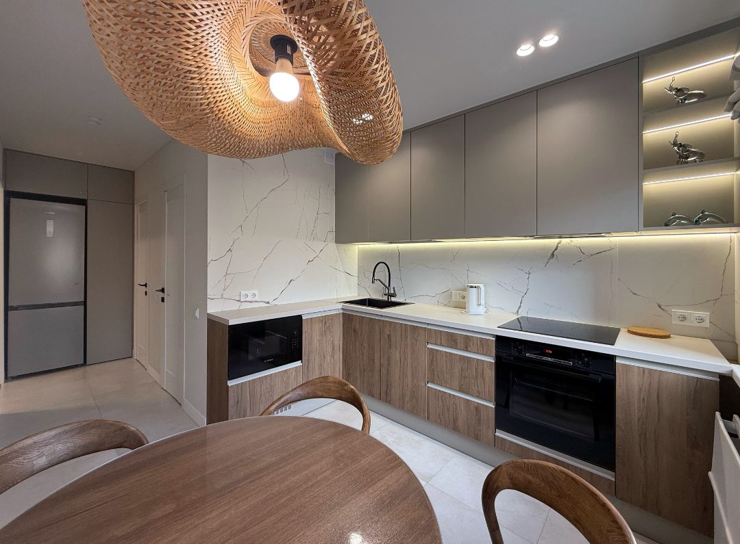 Достаточно просторная, при этом оснащена всем необходимым для комфортного проживания. Полностью укомплектованная кухня: вся посуда и приборы рассчитаны на 4 человек, также наличие приборов для готовки любых блюд; индукционная плита; посудомоечная машина, СВЧ; современный холодильник, электрочайник.