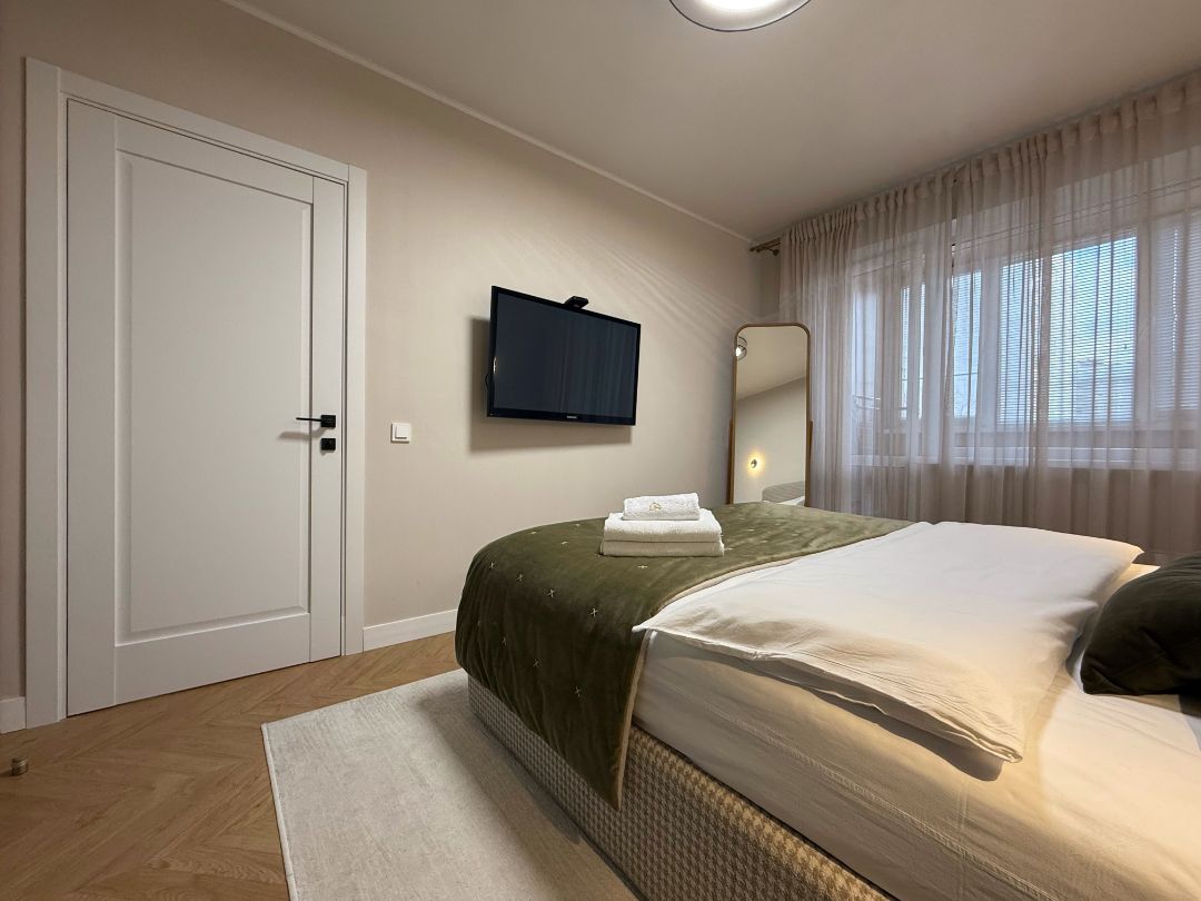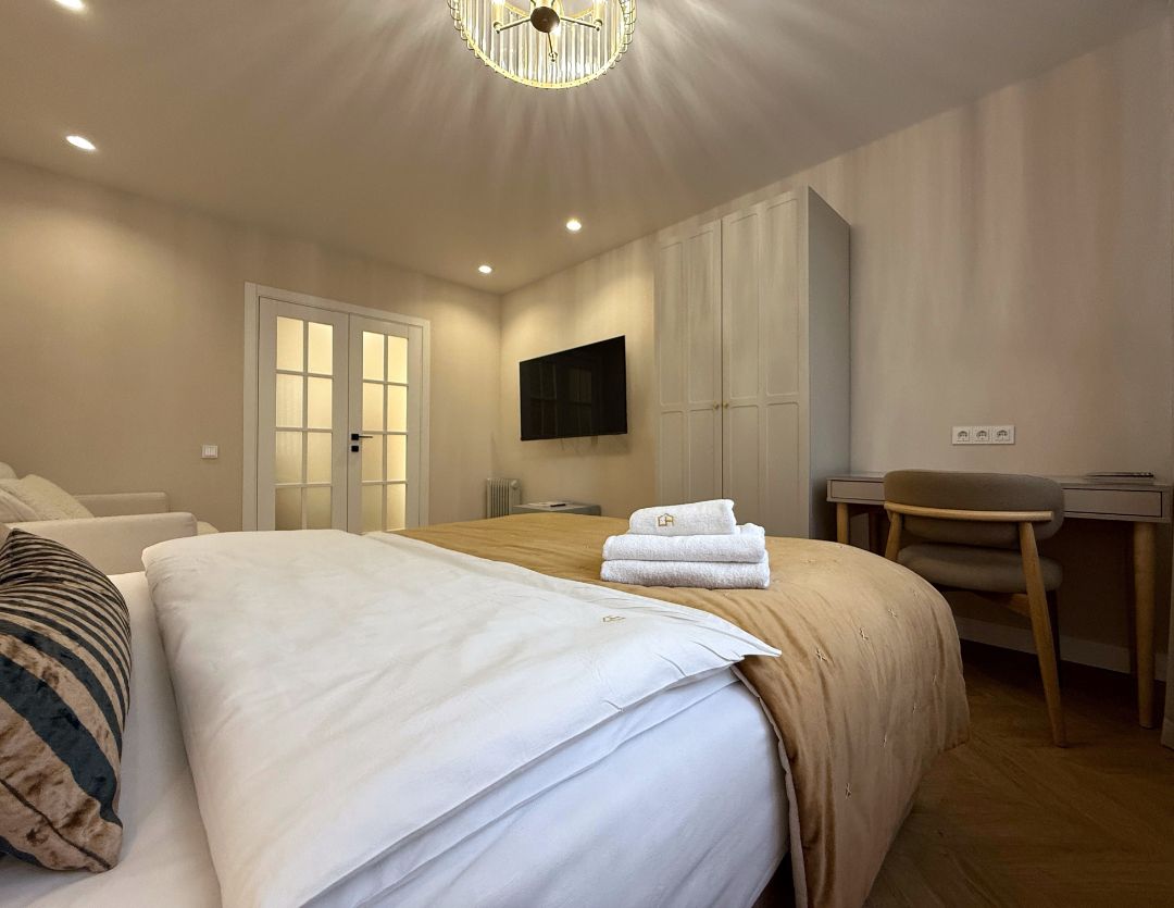 - Общая площадь апартаментов 65 кв метров. Идеальная планировка предоставляет: раздельный санузел; две изолированные спальни, в каждой из которых есть большая двуспальная кровать, застеленная белым сатиновым постельным бельём, изготовленным под заказ.